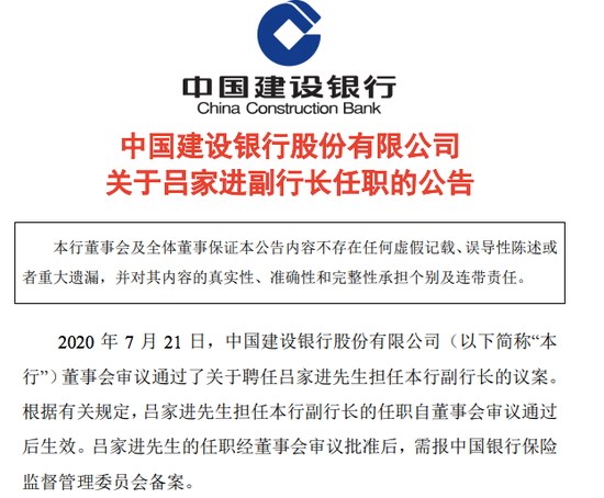 建行7月21日晚间公告,7 月 21 日,中国建设银行股份有限公司董事会审议通过了关于聘任吕家进担任该行副行长的议案。根据有关规定,吕家进担任该行副行长的任职自董事会审议通过后生效。吕家进的任职经董事会审议批准后,需报中国银行保险监督管理委员会备案。