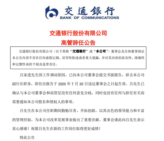 此前,7月20日,交行发布公告,吕家进因工作调动原因,已向该公司董事会提交书面报告,辞去该公司副行长职务,辞任自报告于 2020 年 7 月 20 日送达董事会之日起生效。