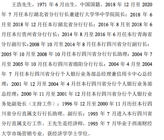 此后,王浩还相继担任建行四川省分行副行长、建行青海省分行副行长、建行贵州省分行行长、建行湖北省分行行长等职位。