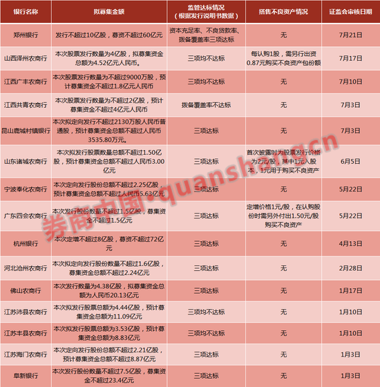 搭售不良资产的定增计划获批的银行共有3家,直接获批的有广东四会农商行和山西泽州农商行,被证监会问询后修改方案的有一家,为山东诸城农商行。