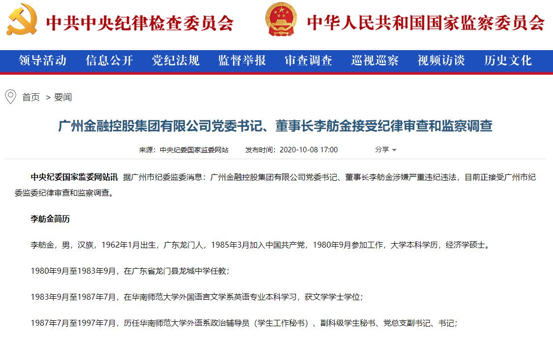 外界尚在好奇原委之时,10月8日,据广州市纪委监委消息,广州金融控股集团有限公司党委书记、董事长李舫金涉嫌严重违纪违法,目前正接受广州市纪委监委纪律审查和监察调查。
