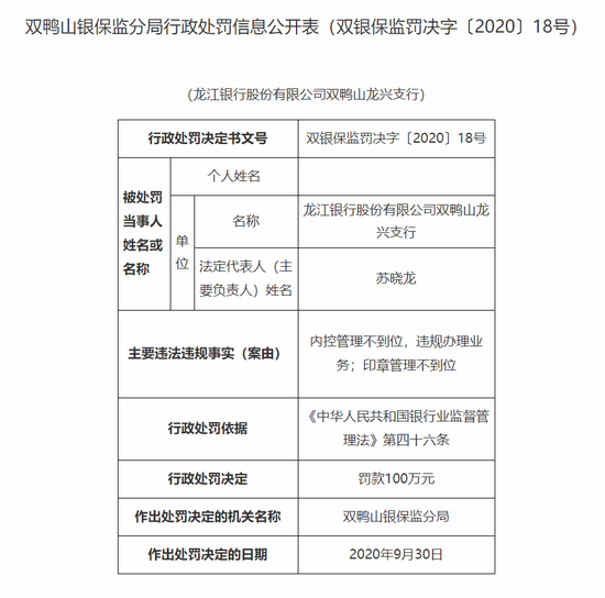 龙江银行股份有限公司双鸭山龙兴支行因内控管理不到位,违规办理业务;印章管理不到位,被罚100万元。
