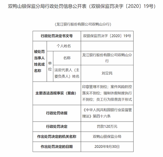罚单信息显示,龙江银行股份有限公司双鸭山分行因印章管理不到位;案件风险防控落实不到位;强制休假制度执行不到位;员工行为排查流于形式等违法违规行为,被处罚款120万元。