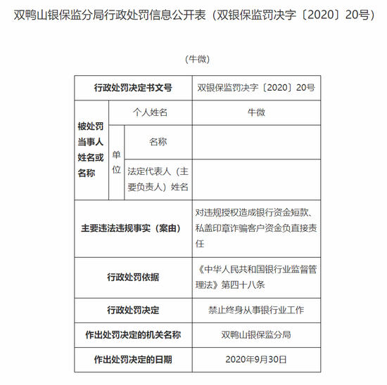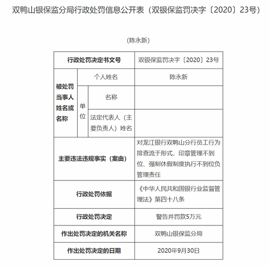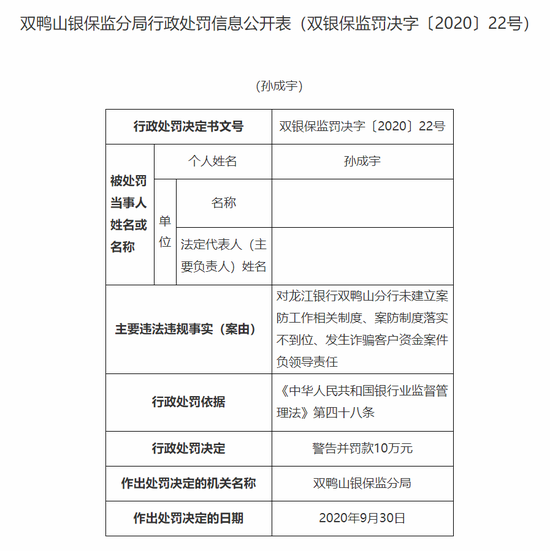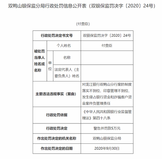 同时,相关责任人牛微对违规授权造成银行资金短款、私盖印章诈骗客户资金负直接责任,被禁止终身从事银行业工作;徐萌萌对未执行存款业务管理操作规程、存款业务逆程序操作负直接责任,被禁止3年从事银行业工作;孙成宇对龙江银行双鸭山分行未建立案防工作相关制度、案防制度落实不到位、发生诈骗客户资金案件负领导责任,受到警告处分并被罚款10万元;陈永新对龙江银行双鸭山分行员工行为排查流于形式、印章管理不到位、强制休假制度执行不到位负管理责任,受到警告处分并被罚款5万元;付贵臣对龙江银行双鸭山分行案防制度落实不到位、印章管理不到位、发生侵占银行资金和诈骗客户资金案件负管理责任,受到警告处分并被罚款5万元。
