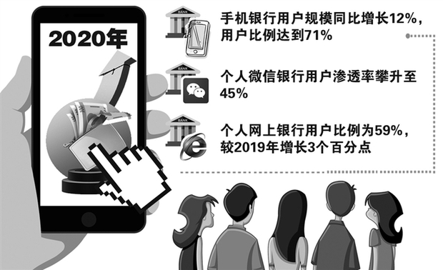 近日,中国金融认证中心(CFCA)发布《2020中国电子银行调查报告》(以下简称《报告》),《报告》显示,2020年,手机银行用户规模保持较快增长,较2019年同比增长12%,用户比例达到71%;三季度末手机银行活跃用户达3.5亿。个人微信银行用户比例继续稳步增长,用户渗透率攀升至45%。与此同时,个人网上银行用户比例为59%,较2019年增长3个百分点,增速持续放缓。