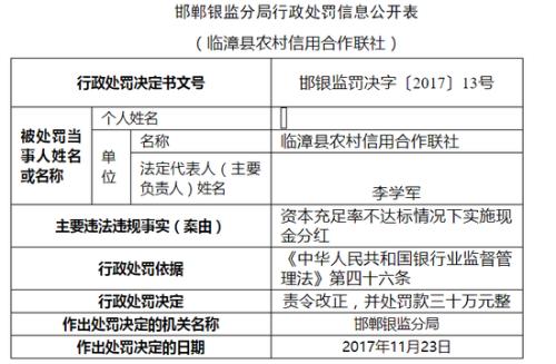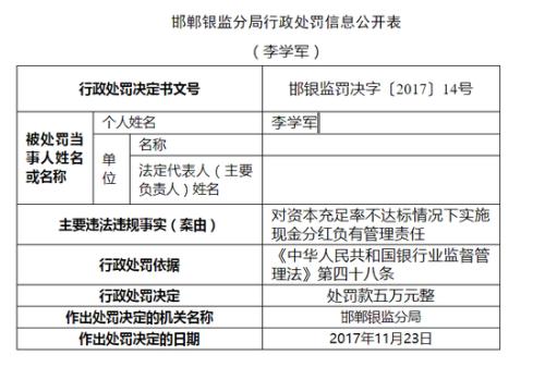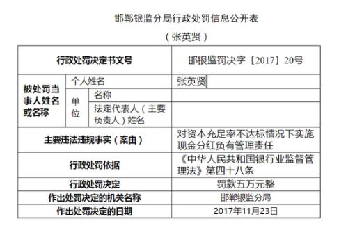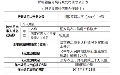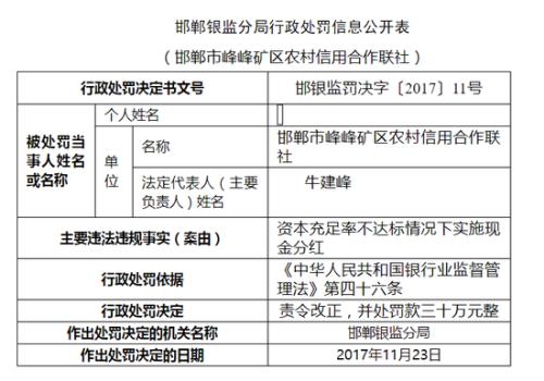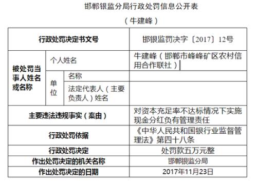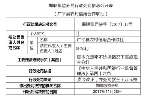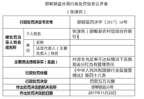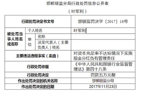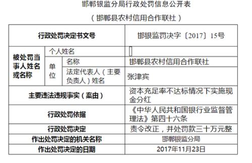 邯郸5家农信社资本充足率不达标下现金分红 被罚175万