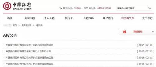 2月11日,中行连发多份公告,涉及四名高管人员的任职变动。此次公告主要是披露监管部门对中行高管人员任职资格的批复,此次公布的涉及四名高管人员委任的公告中,有两名委任为执行董事,一名委任为副行长,一名为风险总监。