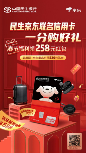 据悉,本次发行的“民生·京东联名信用卡”为标准白金卡级别。卡面设计选用京东吉祥物Joy形象,以经典红黑配色结合“JD”浮雕LOGO,并加入温变显示元素,达到一定温度后卡面吉祥物Joy右侧会出现“JD”字样,设计精巧,颇具趣味性。此外,该产品还有多项尊享专属权益,涵盖从开卡到用卡全流程的优惠福利,可谓诚意满满:新客户激活即可参与“一分购”活动,多种权益一分钱任选其一,包括全年无限次洁牙、京东百元满减券、多种实物好礼随心挑等;周周刷卡周周可获赠10元京东支付立减券,全年可获赠高达520元立减券。值得一提的是卡片上线首月更有新春限定好礼,新客户激活用卡达标最高可得258元消费红包。