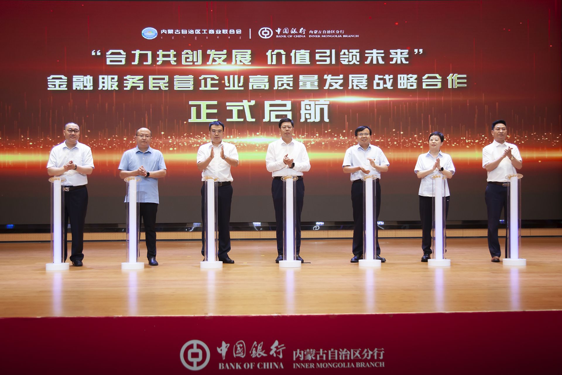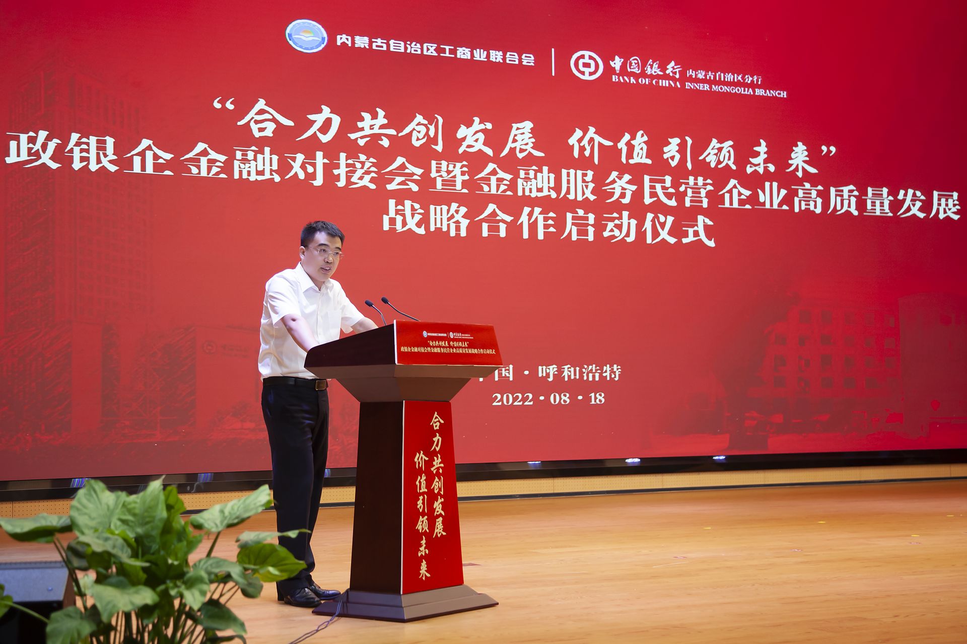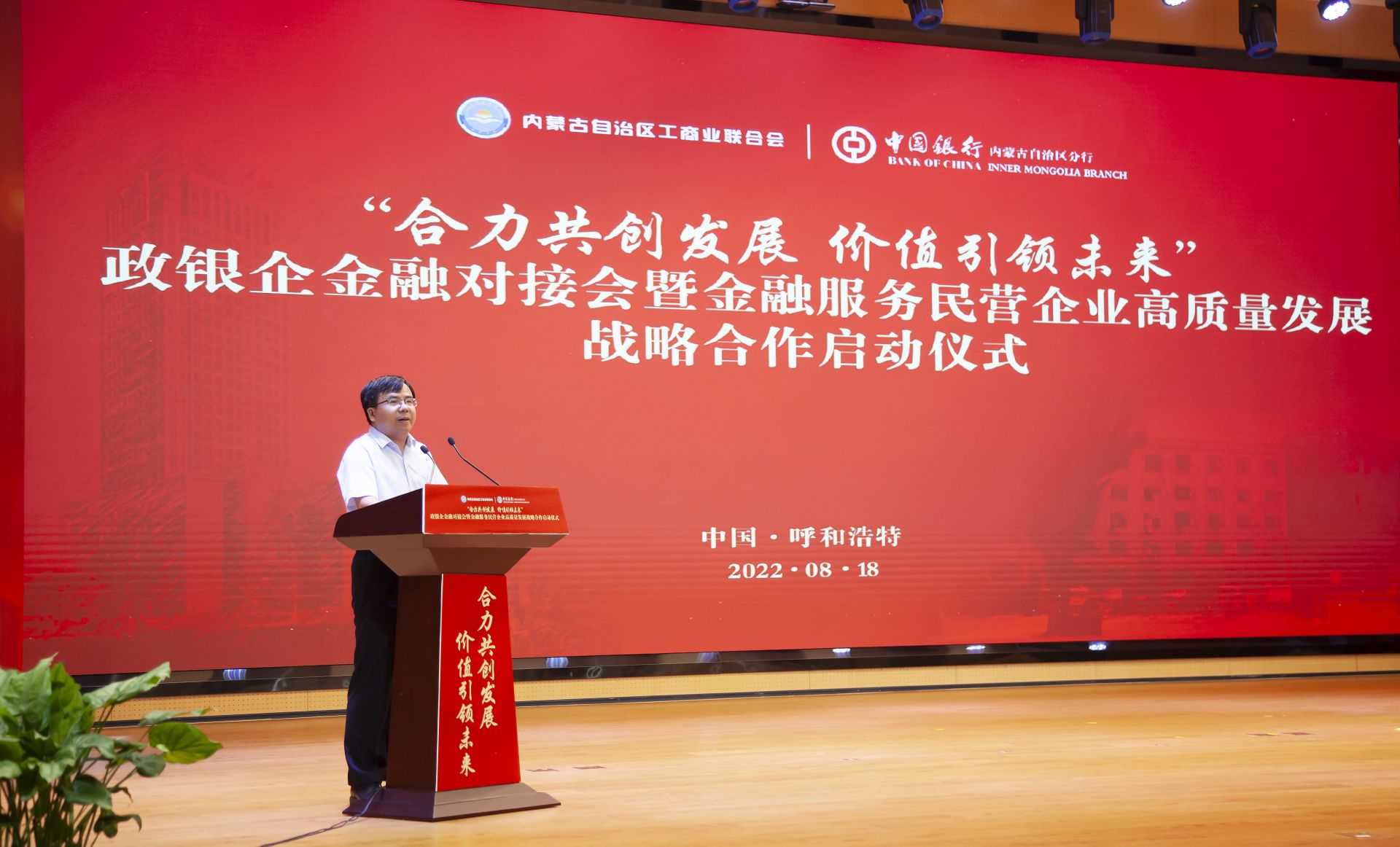 8月18日,中国银行内蒙古自治区分行与内蒙古自治区工商业联合会“合力共创发展 价值引领未来”政银企金融对接会暨金融服务民营企业高质量发展战略合作启动仪式在呼和浩特举行。自治区政协副主席、工商业联合会主席安润生,自治区工商业联合会提名副主席温殿龙,中国银行内蒙古自治区分行党委书记、行长胡文勇,中国银行内蒙古自治区分行党委委 员、副行长雲雯妍出席活动。自治区工商业联合会相关部门以及行业协会、商会、企业代表,中国银行内蒙古自治区分行相关部门及直属支行负责人参加活动。