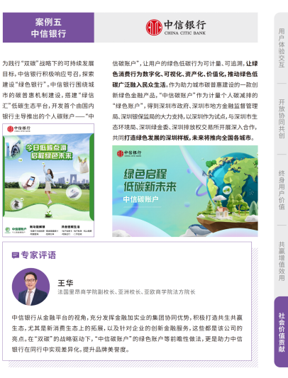 在社会价值贡献方面,为践行“双碳”战略下的可持续发展目标,中信银行积极响应号召,以“绿色银行”理念为指引,围绕城市的碳普惠机制建设,搭建“绿·信·汇”低碳生态平台,开发首个由国内银行主导推出的个人碳账户——“中信碳账户”,让用户的绿色低碳行为可计量、可追溯,让绿色消费行为数字化、可视化、资产化、价值化,推动绿色低碳广泛融入民众生活。“中信碳账户”作为计量个人碳减排的“绿色账户”,得到深圳市政府、深圳市金融局、深圳市银保监局的大力支持,以深圳作为试点,与深圳生态环境局、深圳绿金委、深圳排放权交易所开展深入合作,共同打造绿色发展的深圳样板,未来将推向全国各城市。