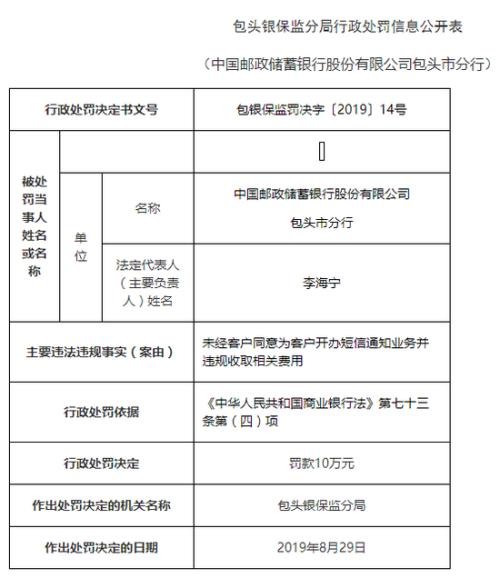 近日,包头银保监分局公布了对中国邮政储蓄银行包头市分行的行政处罚信息,该行的主要负责人是李海宁。处罚信息显示,中国邮政储蓄银行包头市分行因未经客户同意为客户开办短信通知业务并违规收取相关费用。包头银保监分局对该行处以罚款10万元。