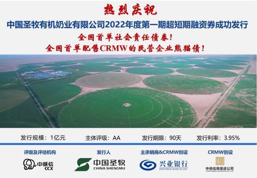 2022年,兴业银行呼和浩特分行落地全国首单社会责任债券——中国圣牧社会责任债券(熊猫债)1亿元,同时配售CRMW,为全国首单标的债务为民营企业熊猫债的CRMW。本笔社会责任债券募集资金用于向偏远农村进行饲料采购,帮扶低收入群体获得稳定收入,助力乡村振兴,对于分行树立“债券银行”的专业品牌形象及践行社会责任的使命担当意义重大。