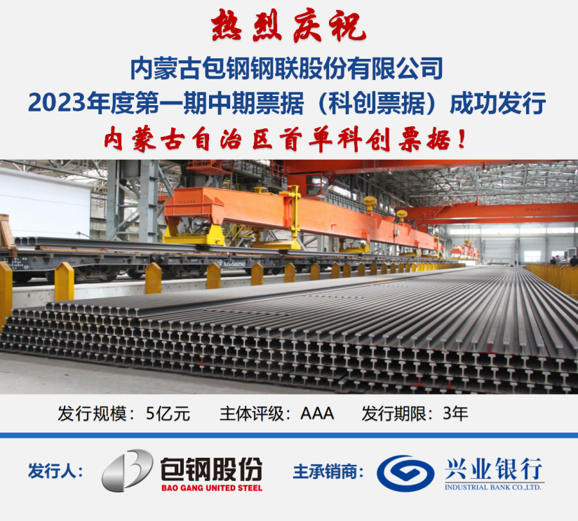 2023年,由兴业银行呼和浩特分行独家主承销的内蒙古包钢钢联股份有限公司2023年第一期中期票据(科创票据)在银行间债券市场成功发行,该笔债券为内蒙古自治区首单科创票据,是分行持续运用创新债券加强对科创企业金融支持的重要体现。