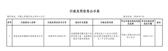 西昌金信村镇银行被罚37.25万:违规报送可疑交易报告