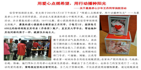 小王丹不知道,生命中的温暖阳光与来自遥远地方的大爱真情逐渐向这朵“坚强的小花”聚拢......王丹事迹播出后的第一时间,兴业银行信用卡中心信贷审核部所属党支部就发起“用爱心点燃希望,用行动播种阳光”的爱心捐助活动。
