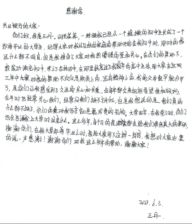 “我们相信王丹这位善良的姑娘,定会接力兴业人的大爱精神,带着温暖和希望,把真情洒向更为广阔的天地,让金融助力生活更美好!”兴业银行信用卡中心信贷审核部所属党支部党员纷纷表示。