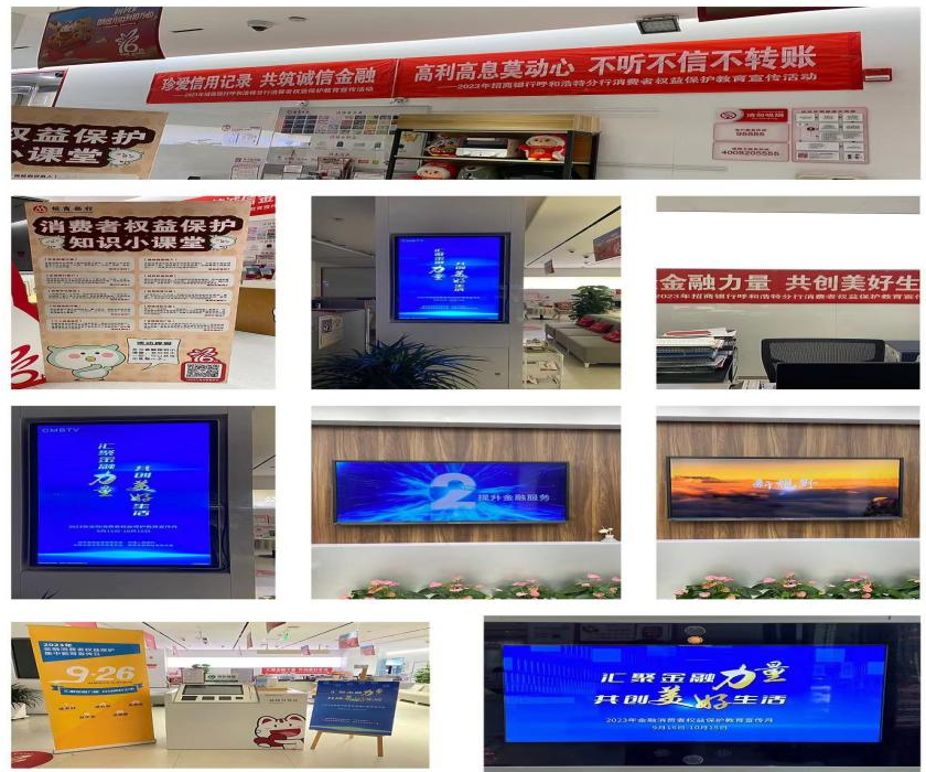 活动期间,招商银行呼和浩特分行各营业网点在厅堂内的公众教育宣传专区摆放并张贴宣传海报、展板及折页;在网点的电子屏幕、电视上播放“汇聚金融力量 共创美好生活”活动宣传片;通过网点门楣电子滚动屏或悬挂横幅展示宣传标语;利用招商银行呼和浩特分行微信公众号、视频号等宣传“以案说险”系列防诈案例,通过线上线下相结合的方式进行深入宣传。