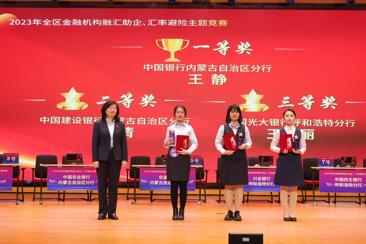 自治区外汇市场自律机制10家成员单位30名选手现场参赛,全区20余家金融机构及30余家进出口企业代表现场观赛,各盟市中心支局相关领导受邀至中国银行内蒙古分行辖内各二级机构分会场视频观赛。经过多轮角逐,中国农业银行内蒙古分行、中国工商银行内蒙古分行、中国光大银行呼和浩特分行获得本次竞赛集体前三名;中国银行内蒙古分行、中国建设银行内蒙古分行、中国光大银行呼和浩特分行获得个人风采展示前三名。
