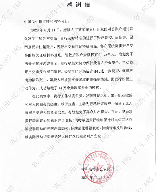 呼和浩特市公安局刑事侦查大队高度肯定我行精准研判、精准打击涉诈可疑账户的举措,对我行主动先行风控可疑账户,积极为公安机关提供线索,有效避免群众财产损失的行为表示衷心的感谢并予以表扬。