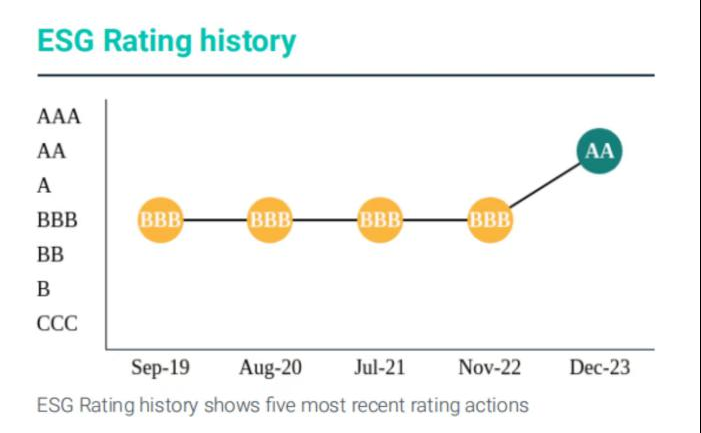 近日,国际权威指数机构摩根士丹利资本国际公司(中文简称“明晟”,英文简称“MSCI”)公布2023年度环境、社会及管治(英文简称“ESG”)评级结果,中国民生银行最新年度ESG评级跃升两级至AA级,为境内银行业最高评级,成为国内首家在一年内实现评级跨越性提升两级的银行。