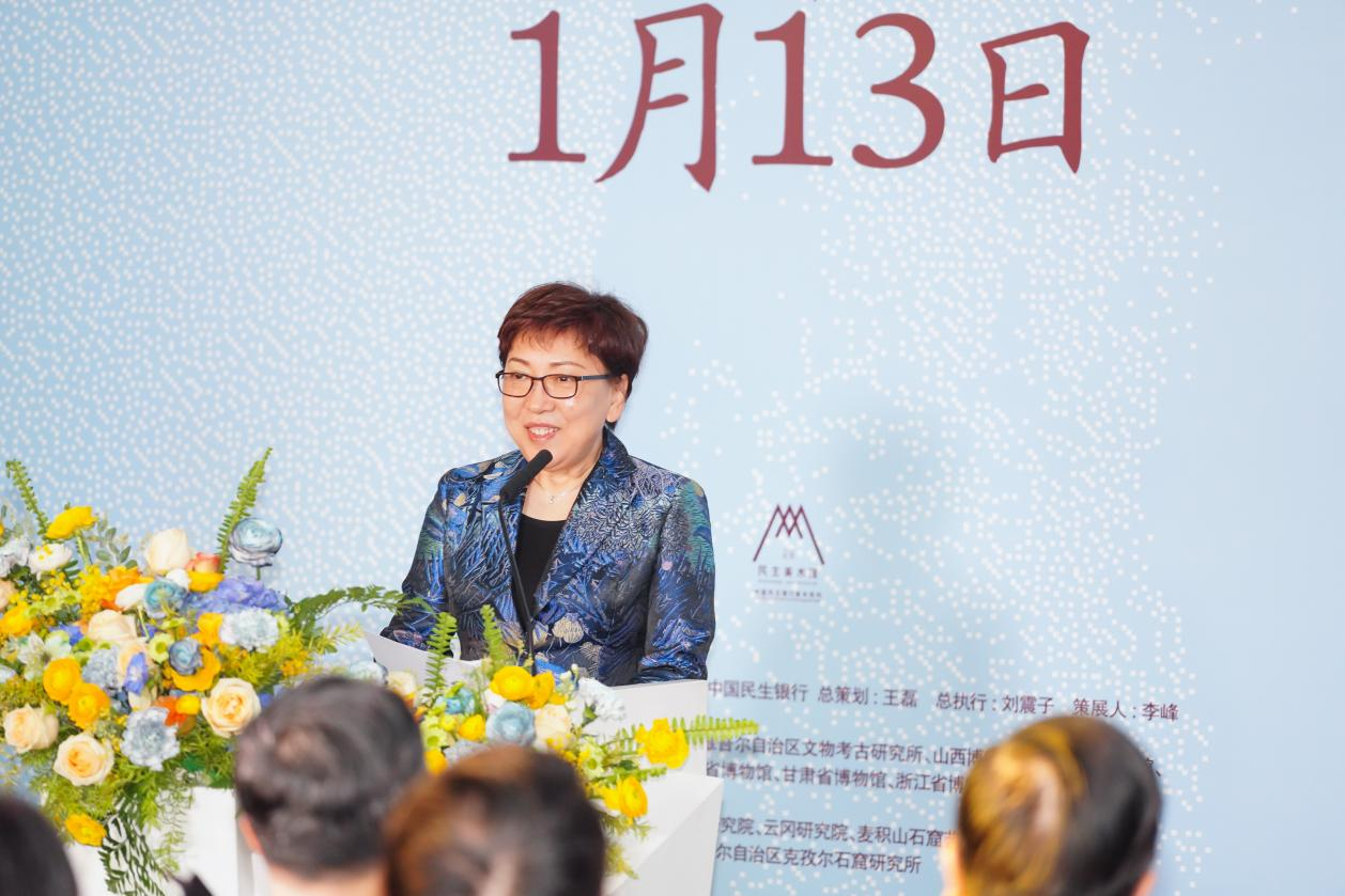 中国民生银行行长郑万春在开幕式中致辞表示,今天,正值民生银行成立28周年之际,我们隆重推出文明的融合“驼铃声响——丝绸之路艺术大展”,既是对中华传统文化的传承与弘扬,更是向“丝绸之路”这一东西方文明交汇融合的物质精神纽带致以崇高敬意。希望通过“文明系列”艺术大展,能够使每一位观众对中国传统文化产生更深的理解和热爱,共同为推动中华文化繁荣兴盛贡献自身力量。