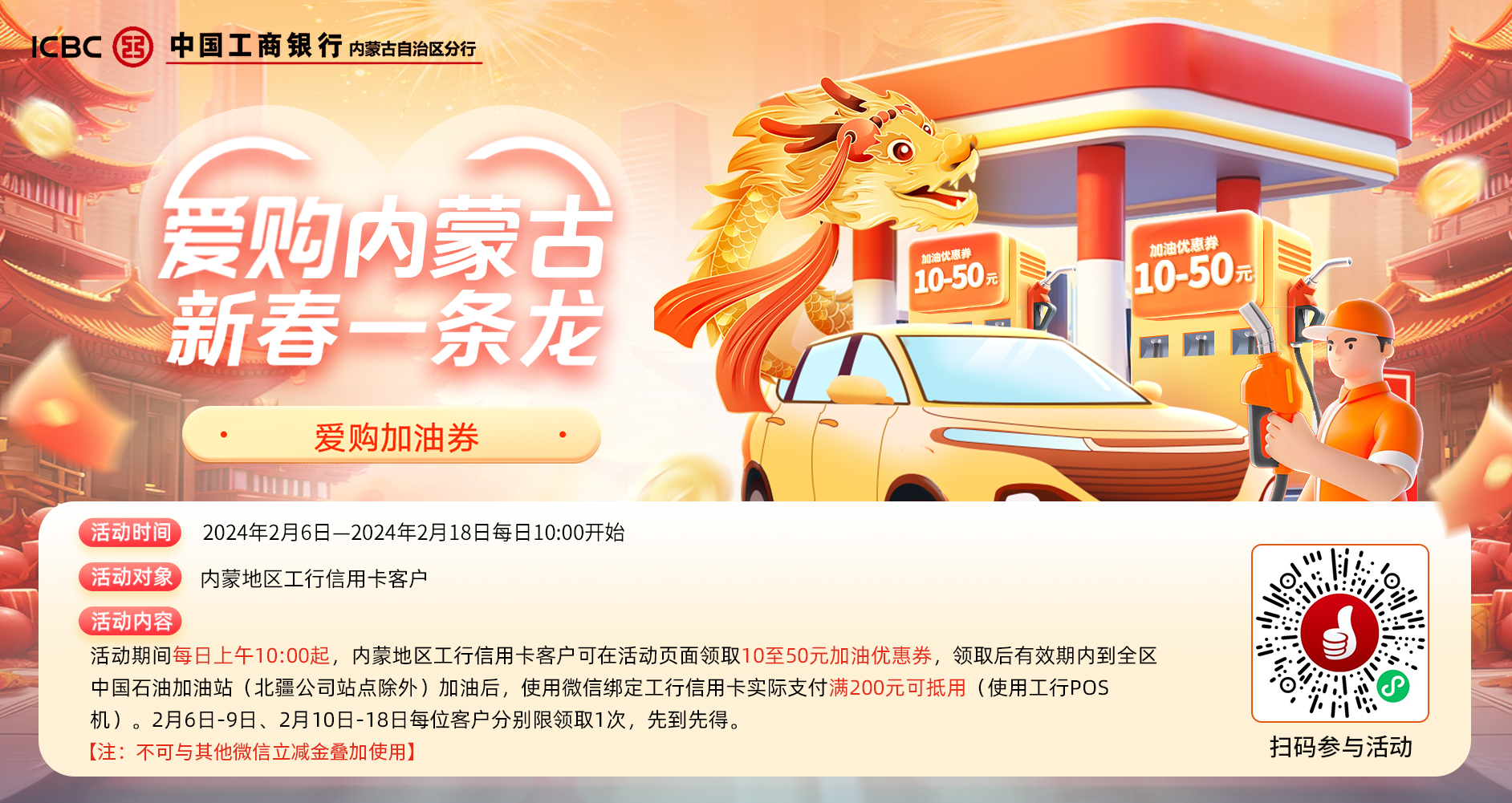 春节出行方面,充分满足节前返乡、走亲访友和节后返岗需求,自2月6日返乡高峰至2月18日返岗期间,工商银行内蒙古分行每日上午10点起投放满200立减10-50元“爱购加油券”,支持在全区中石油各个站点使用,为工行信用卡持卡人的春节旅途“加油”助力。