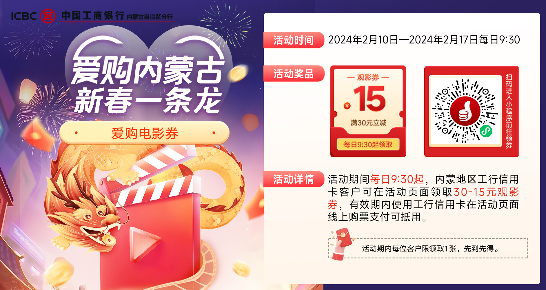贺岁观影方面,紧密契合消费者贺岁观影的娱乐需求,大年初一至初八,工商银行内蒙古分行每日上午9:30发放满30减15元“爱购电影券”,支持在线上平台购买电影票直接立减,可覆盖全区各大影院,助力进一步丰富居民的春节活动。