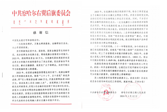 近日,中国民生银行呼和浩特分行收到察哈尔右翼后旗旗委、旗政府的感谢信。信中表示,分行积极响应党中央、国务院、国家金融监管总局的号召,充分发挥自身优势力量,为全旗巩固拓展脱贫攻坚成果与乡村振兴有效衔接作出了突出贡献。
