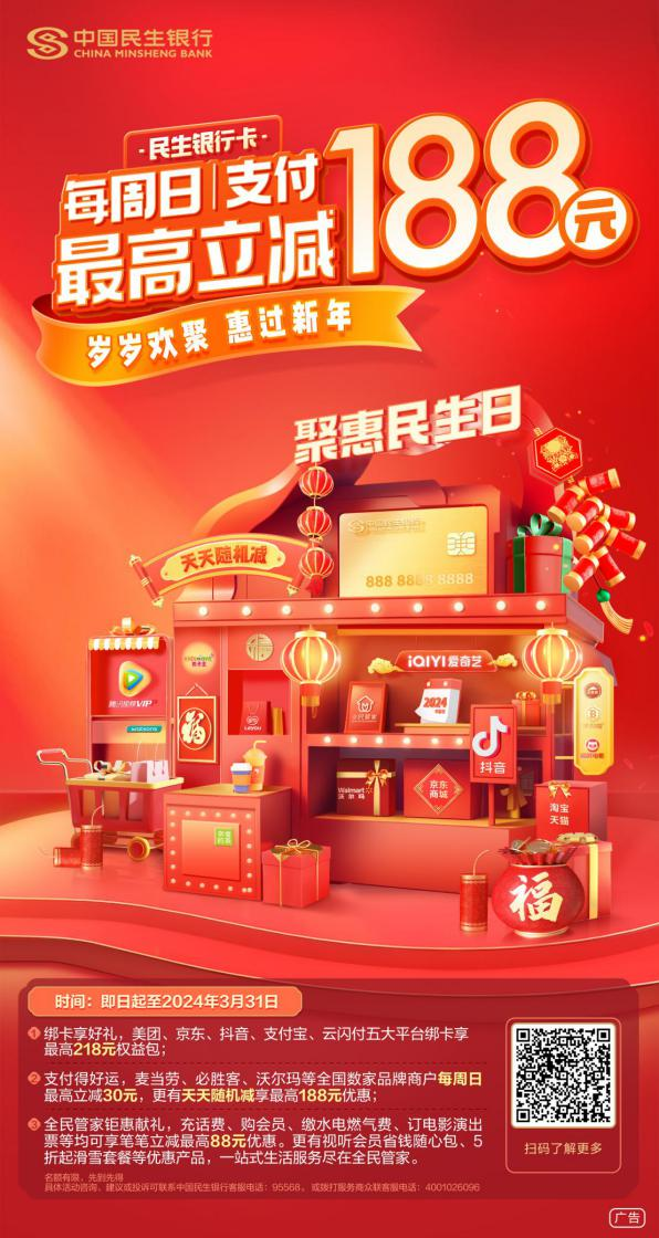 龙年春节期间,中国民生银行信用卡中心(简称“民生信用卡中心”)推出“岁岁欢聚,惠过新年”新春特惠活动,借此惠及千万用户,助力活跃消费。