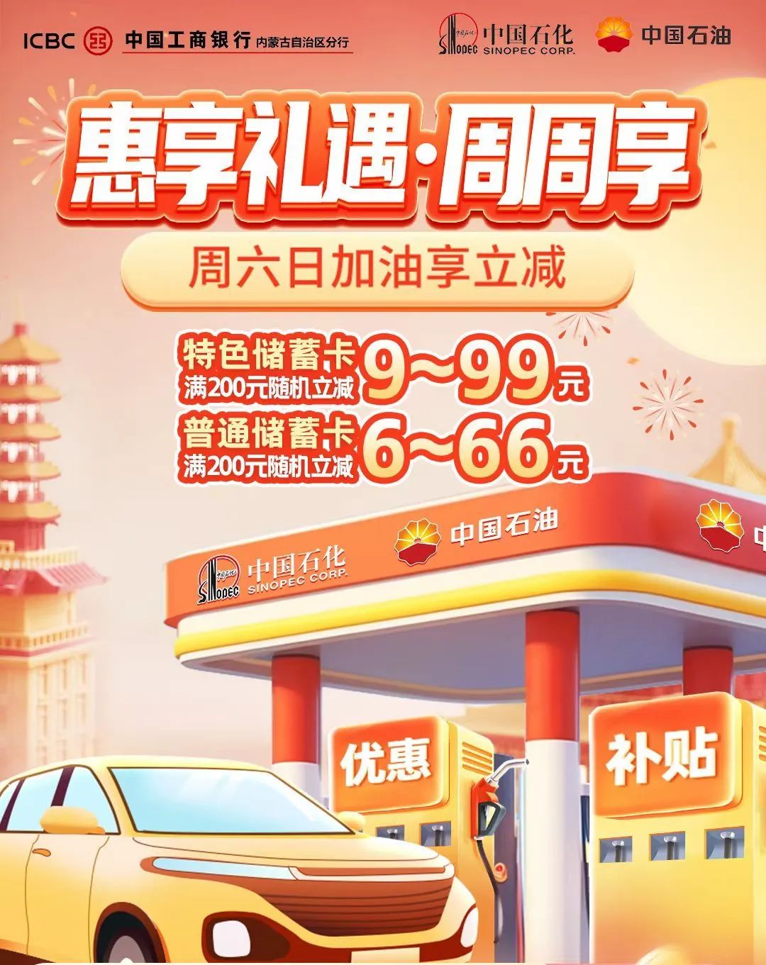 3.普通卡:实际支付满200元随机立减6-66元优惠,每人每周在中国石油、中国石化各有机会参加一次活动。内蒙工行非特色储蓄卡均可参与。