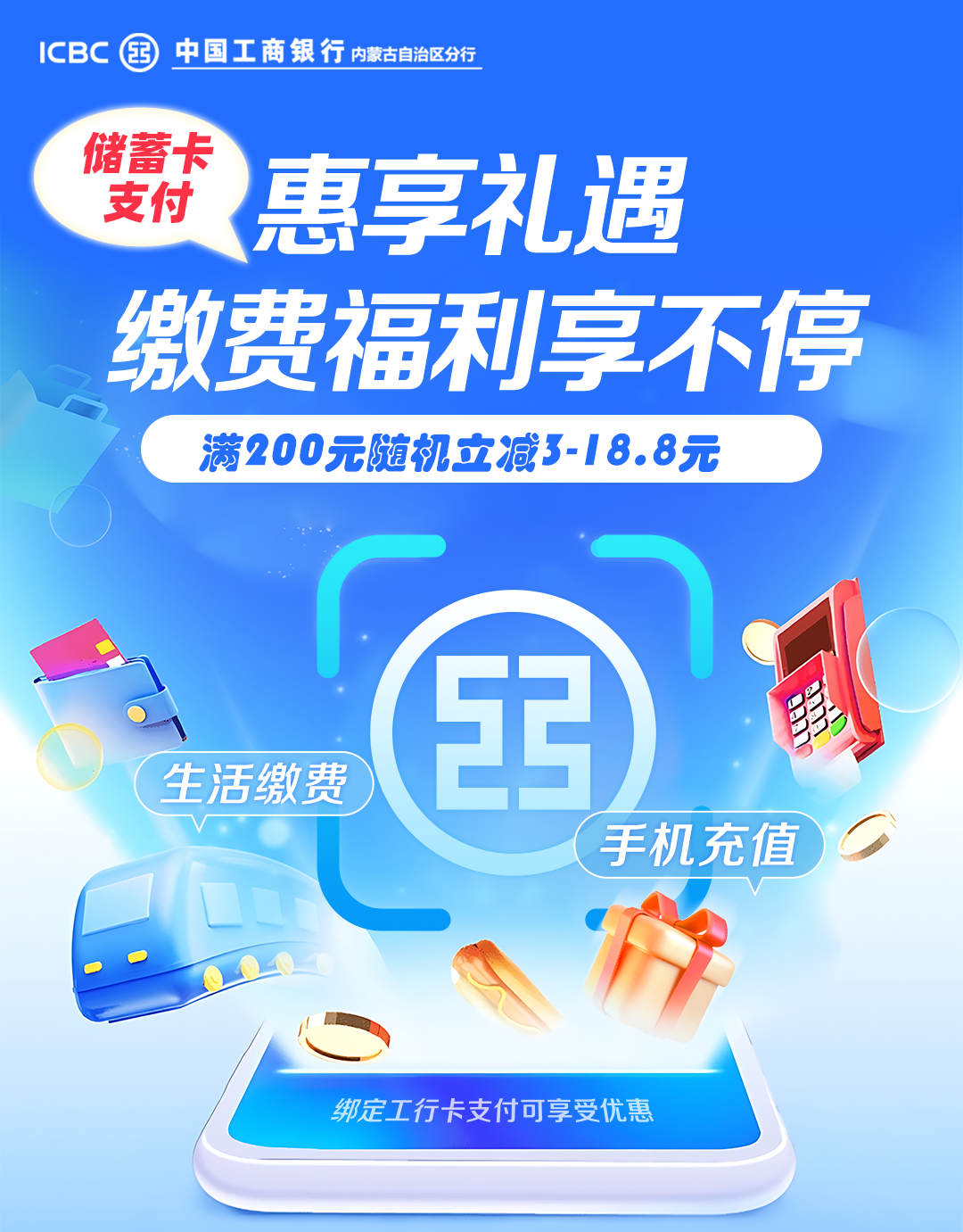 活动期间,客户通过支付宝APP首页-手机充值、生活缴费场景消费,绑定内蒙工商银行储蓄卡支付可享受满200元随机立减3-18.8元。名额有限、先到先得,同一客户活动期内有机会参加1次(同一支付宝账号、手机号、身份证号、手机终端、银行卡号,符合以上任一条件均视为同一客户)。