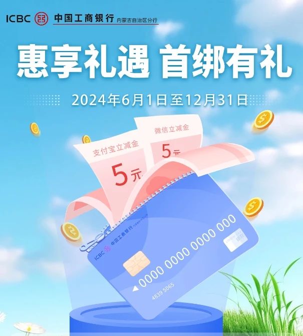 活动内容:活动期间,客户登录手机银行,在“一键绑卡”功能将本人工行内蒙地区借记卡首次绑定至微信、支付宝平台,有机会获得5元微信立减金/5元支付宝红包,名额有限,先到先得。