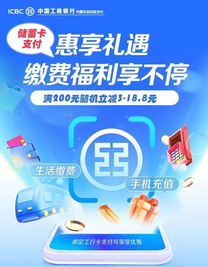 活动内容:活动期间,客户通过支付宝APP首页-手机充值、生活缴费场景消费,绑定内蒙工商银行储蓄卡支付可享受满200元随机立减3-18.8元。名额有限、先到先得,同一客户活动期内有机会参加1次(同一支付宝账号、手机号、身份证号、手机终端、银行卡号,符合以上任一条件均视为同一客户)。
