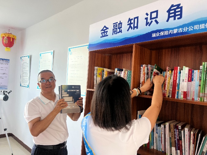 活动现场,瑞众保险内蒙古分公司精心挑选了涵盖金融知识、保险常识、防骗技巧等内容的书籍,赠送给每一位村民,向村民介绍金融市场的基本知识,详细解读金融消费者八项基本权利,发放消费者权益保护金融知识的教育宣传册。瑞众保险内蒙古分公司消费者权益保护处负责人与村民互动了解生活中遇到的电信诈骗,向村民们做出风险提示,提醒村民防范诈骗、远离非法集资。同时,为了方便村民们随时翻阅学习,瑞众保险内蒙古分公司特别定制了书籍展架,设置“金融知识角”,为村民们提供一个便捷、舒适的阅读环境。希望通过这一举措,搭建起一个信息交流的平台,让村民们能够轻松获取新知识、新信息,拓宽视野,增进交流,推动乡村文化的繁荣与发展。
