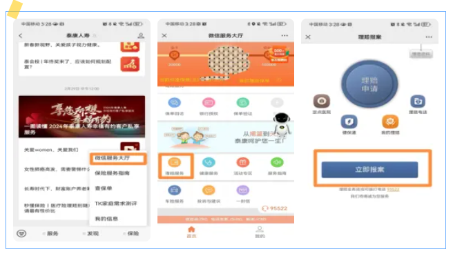 微信报案:关注“泰康人寿”官方微信,点击“服务大厅”进入“自助理赔”申请理赔报案