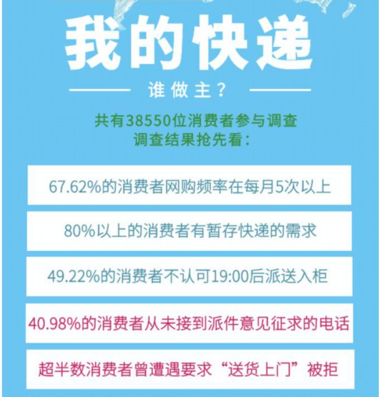 本次调查共回收有效问卷38550份,从结果看,67.6%的消费者网购频率在每月5次以上。80%以上的消费者有暂存快递的需求,49.22%的消费者不认可19:00后派送入柜,40.98%的消费者从未接到派件意见征求的电话,超半数消费者曾遭遇要求“送货上门”被拒。