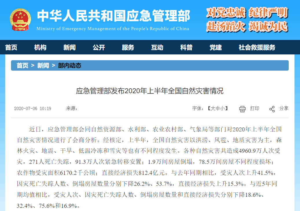 7月6日,应急管理部发布2020年上半年全国自然灾害情况。数据显示,上半年各种自然灾害共造成4960.9万人次受灾,271人死亡失踪,91.3万人次紧急转移安置;1.9万间房屋倒塌,78.5万间房屋不同程度损坏;农作物受灾面积6170.2千公顷;直接经济损失812.4亿元。