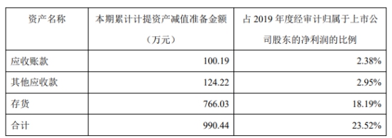 此外,年报披露同日,安奈儿披露了关于2019年度计提资产减值准备的公告,经公司及下属子公司对2019年末可能存在减值迹象的各类资产进行全面检查和减值测试后,2019年度计提各项资产减值准备合计990.45万元,占2019年度经审计归属于上市公司股东的净利润的 23.52%,其中:应收款项坏账准备(含应收账款、其他应收款)224.42万元,存货跌价准备766.03万元。