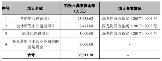 安奈儿上市时披露的公告书显示,公司上市发行股份数量不超过2500万股,募集资金总额为4.27亿元,扣除发行费用后募集资金净额为3.79亿元,分别用于“营销中心建设项目”、“设计研发中心建设项目”、“信息化建设项目”、“补充其他与主营业务相关的营运资金”。