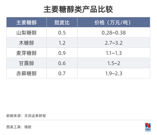 据其苏打气泡水产品包装显示,除了赤藓糖醇,成分表中还有三氯蔗糖。据国金化工研报,三氯蔗糖又名三氯半乳蔗糖、蔗糖素,甜度约为蔗糖的600~650倍。