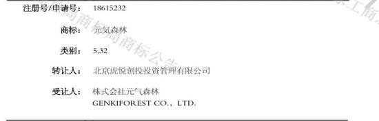 值得注意的是,32类的“元気森林”商标最初由北京虎悦创投投资管理有限公司申请,申请日期为2015年12月16日,此后该商标转让给株式会社元气森林。
