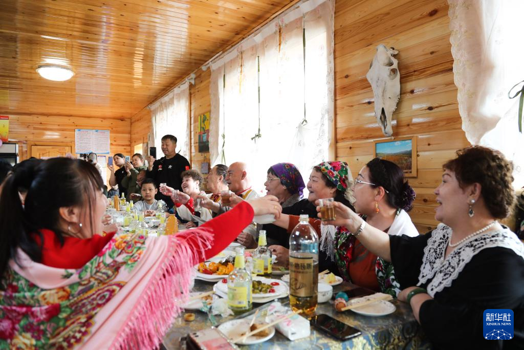 2023年4月16日,额尔古纳市恩和俄罗斯族民族乡群众在午宴上举杯庆祝巴斯克节。