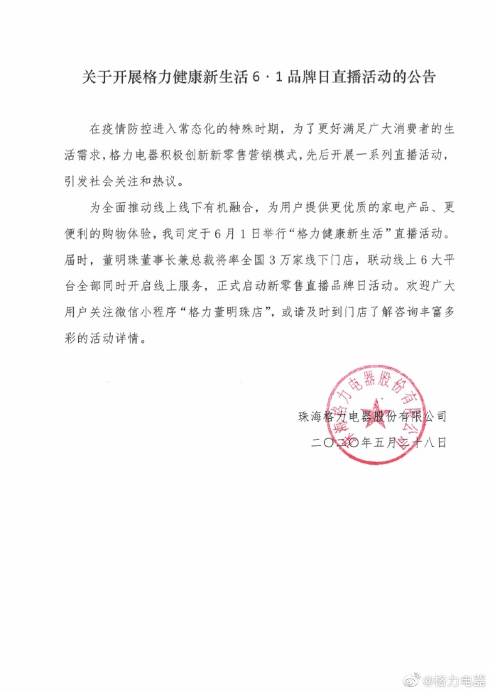 格力电器官方消息,今日早间格力电器发布公告称,格力将于6月1日举行“格力健康新生活”直播活动,届时格力电器董事长董明珠将携3万家线下门店,联动线上6大平台全部同时开启线上服务。