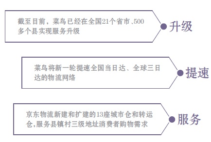 值得注意的是,菜鸟与京东在提速计划中,均指向了低线城市和乡镇市场。
