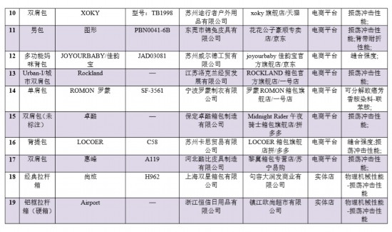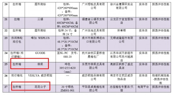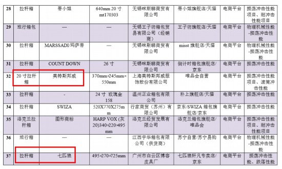旅行箱包方面,抽查共发现20批次产品不合格,其中20批次产品振荡冲击性能不合格,使用中易出现提把或拉杆断裂、脱落等现象,影响正常使用。2批次产品耐冲击性能(跌落性能)不合格,在跌落时易产生箱体变形、配件脱落等问题。1批次产品滚筒冲击性能不合格,箱面在受到冲击易出现开裂破损现象。