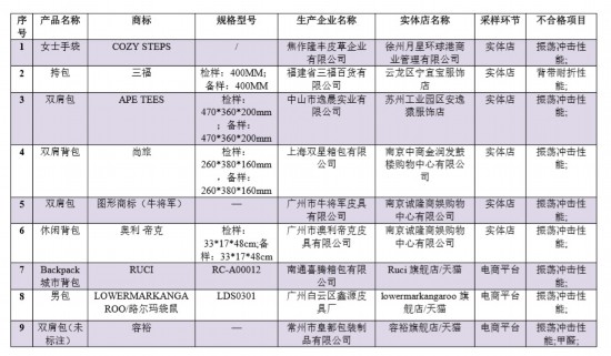 背提包方面,抽查共发现17批次产品不合格,其中14批次产品振荡冲击性能不合格,缝制质量较差,在使用过程中容易出现提把同包体断裂,部件开线、脱落、断裂现象;2批次产品缝合强度不合格,缝口易开线撕裂;2个批次产品背带耐折性能不合格,表面涂层易开裂;1个批次产品甲醛项目不合格,1批次产品可分解芳香胺染料不合格。