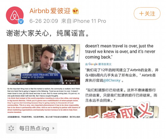 此外,Airbnb 中国区传播团队表示,上述谣言是对Brian Chesky讲话内容的误读,Brian Chesky的意思是疫情让旅游变了,接下来旅行会重新分布,以周边游为主。