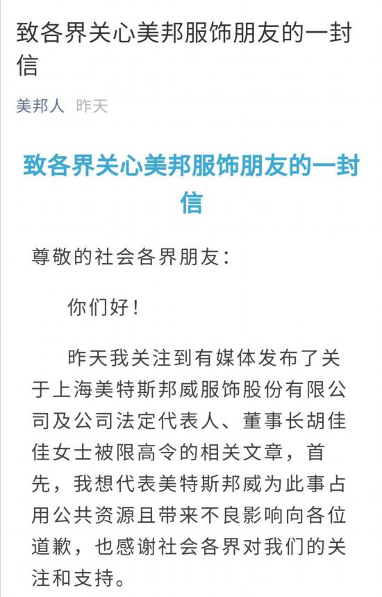 6月29日,美邦服饰创始人周成建在“美邦人”微信公众号发布公开信,回应美邦服饰及其女儿(美邦服饰法定代表人、董事长胡佳佳)被法院下发限制消费令一事,称对此深感自责和愧疚。美邦服饰29日也发布澄清公告称,法院对公司及胡佳佳的限制消费令已解除。