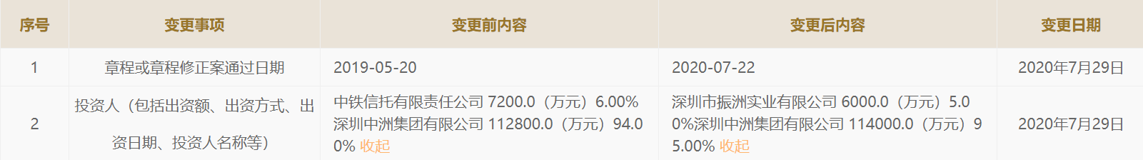 另一原持股6%的股东中铁信托有限责任公司退出,新增股东深圳市振洲实业有限公司,持股比例5%。