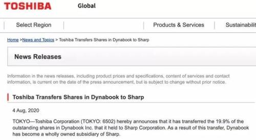 据钛媒体援引TheVerge 8月9日报道,2年前,东芝将其80.1%的电脑业务股份以3600万美元的价格卖给了夏普,夏普将这一部门重新命名为Dynabook。2020年6月,夏普行使了购买东芝剩余19.1%股份的权利,东芝在8月4日发布声明称,交易已经完成。